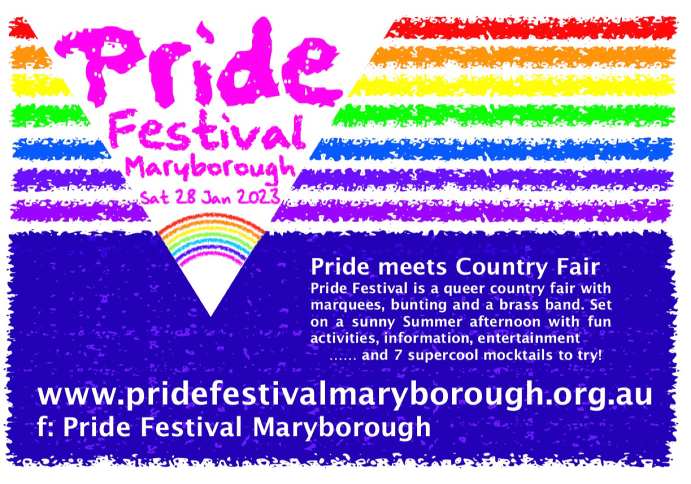 My current work is the design, development and delivery of Pride Festival Maryborough. This is an exciting project to deliver for the community. Visit our website after the grand reveal of 30th Nov. www.pridefestivalmaryborough.org.au